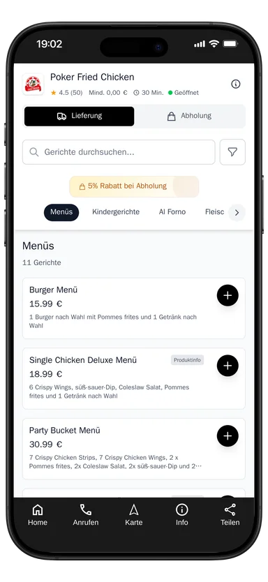 10 Chicken Wings, 10 Chicken Strips,10 Chicken Nuggets, 2x Pommes frites und 3x süß-sauer-Sauce